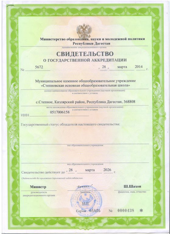 Адрес местонахождения образовательной организации* 368808 РД Кизлярский район с.Степное,ул.Ленина, дом 16